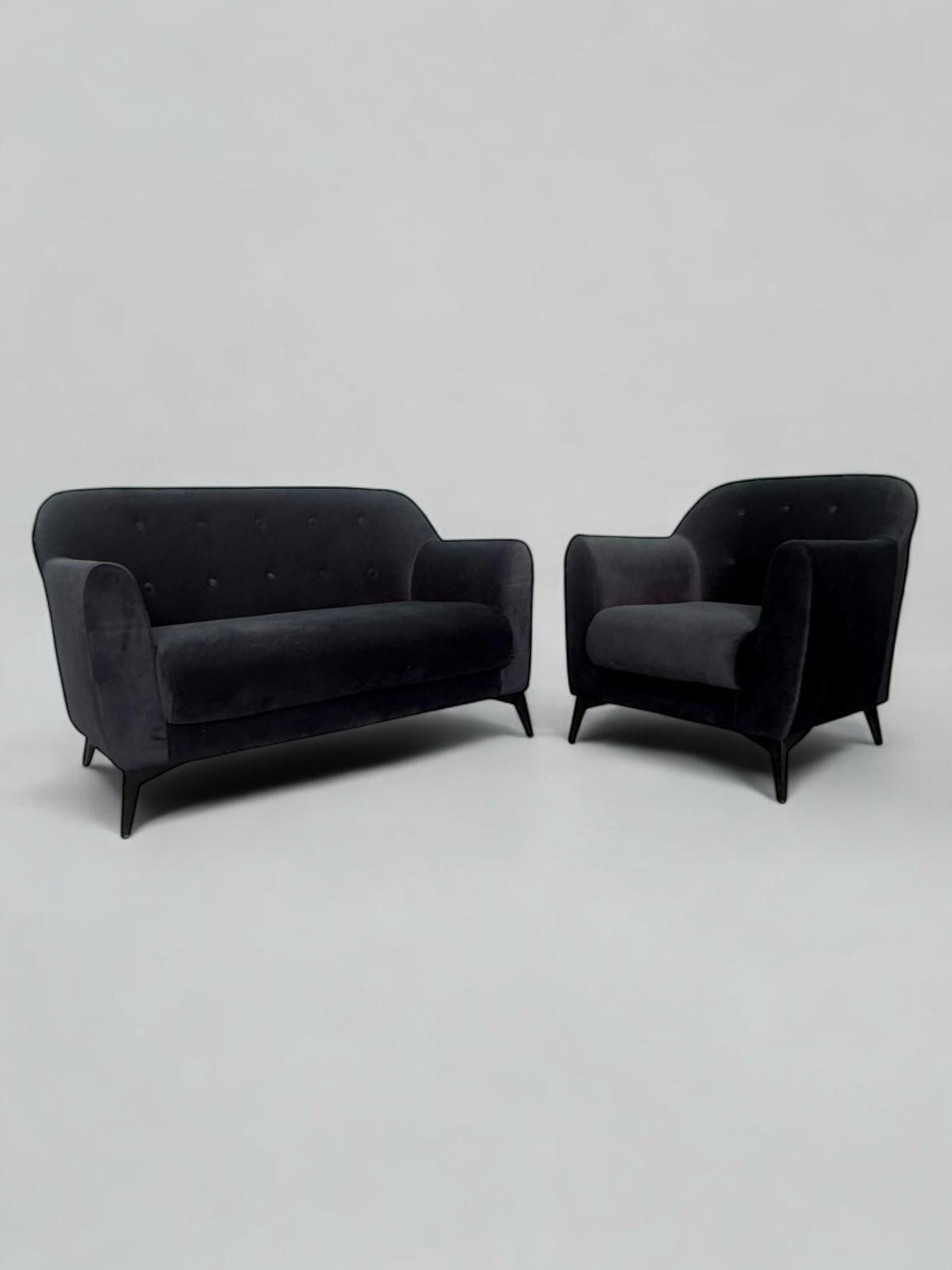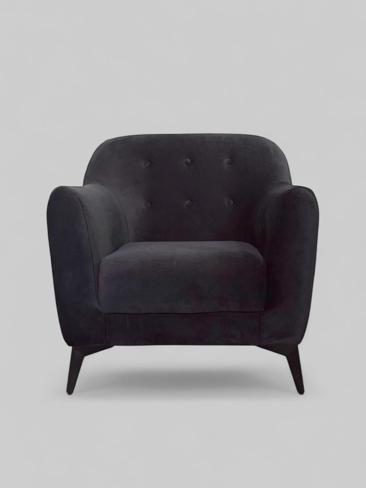 A luxurious black velvet single-seater sofa with sleek black metal legs, fully customizable in color and upholstery.