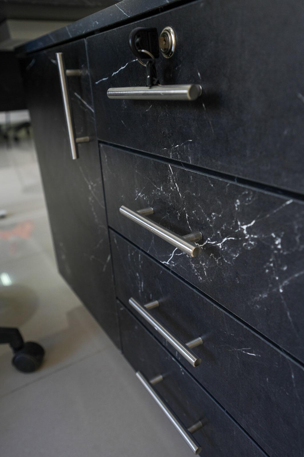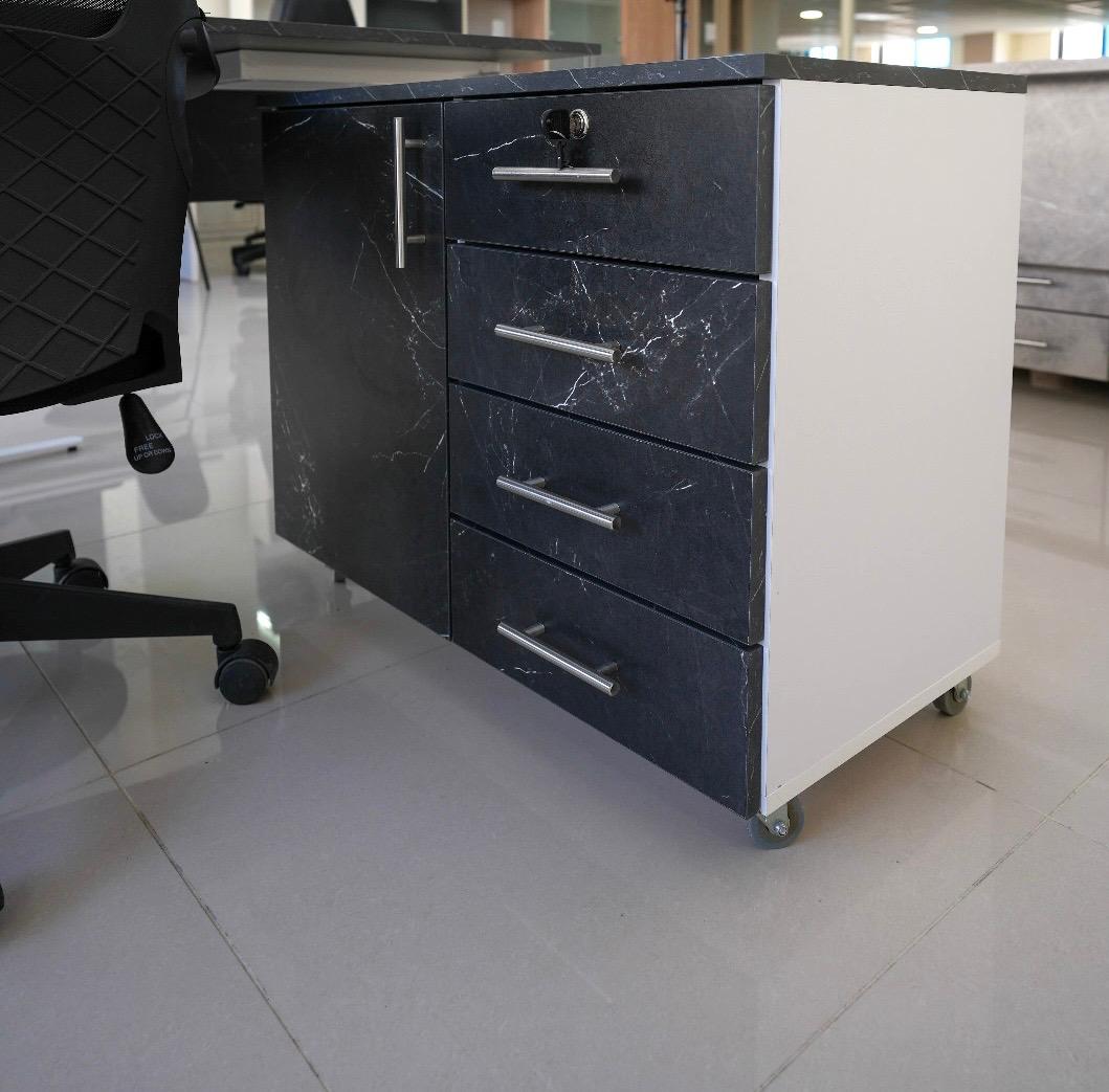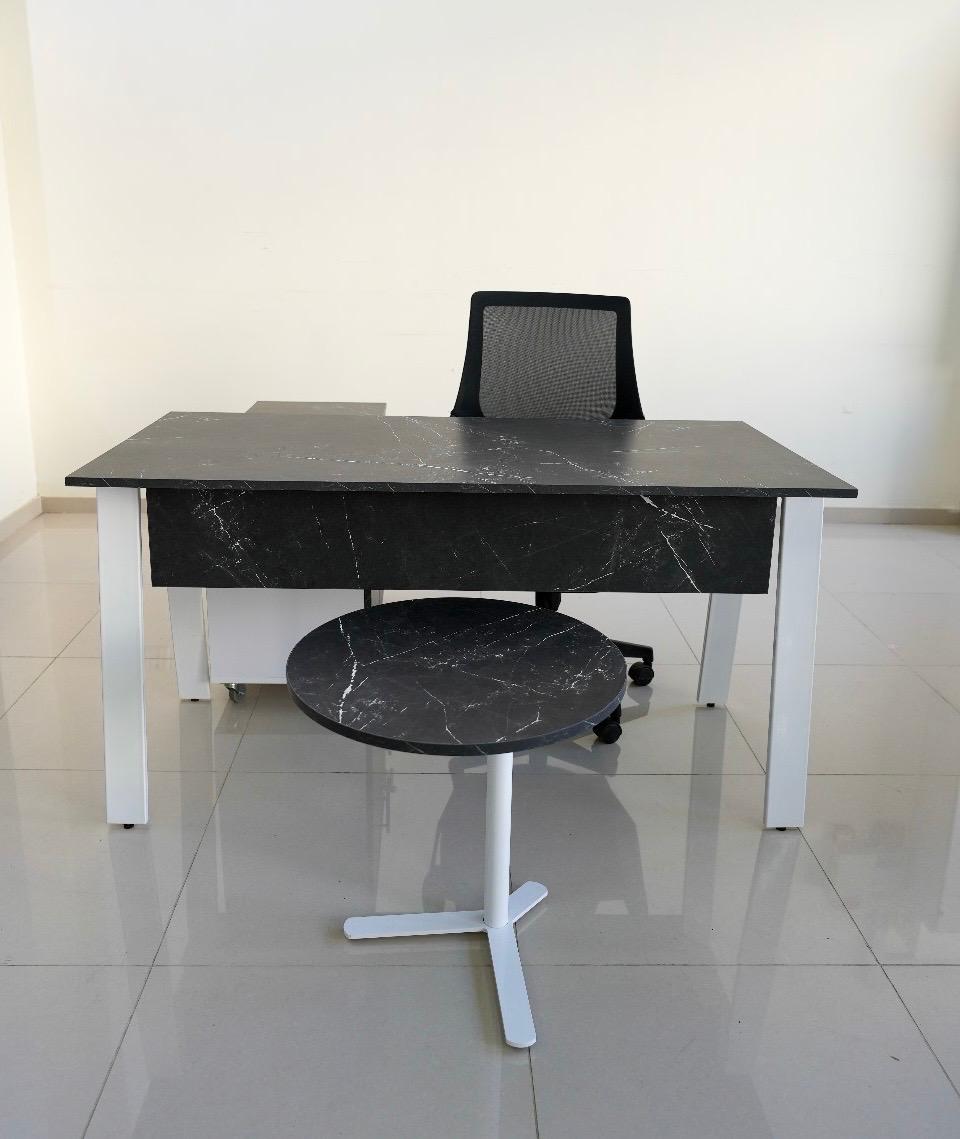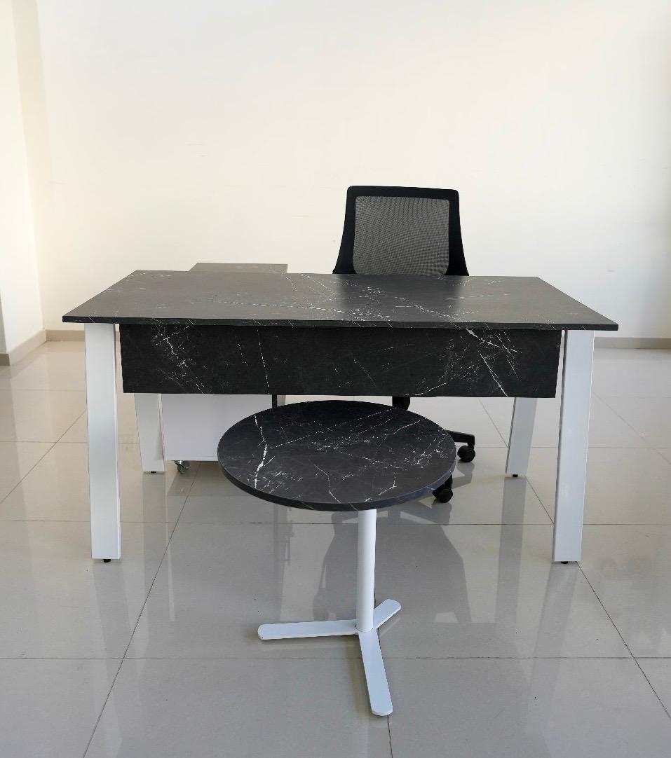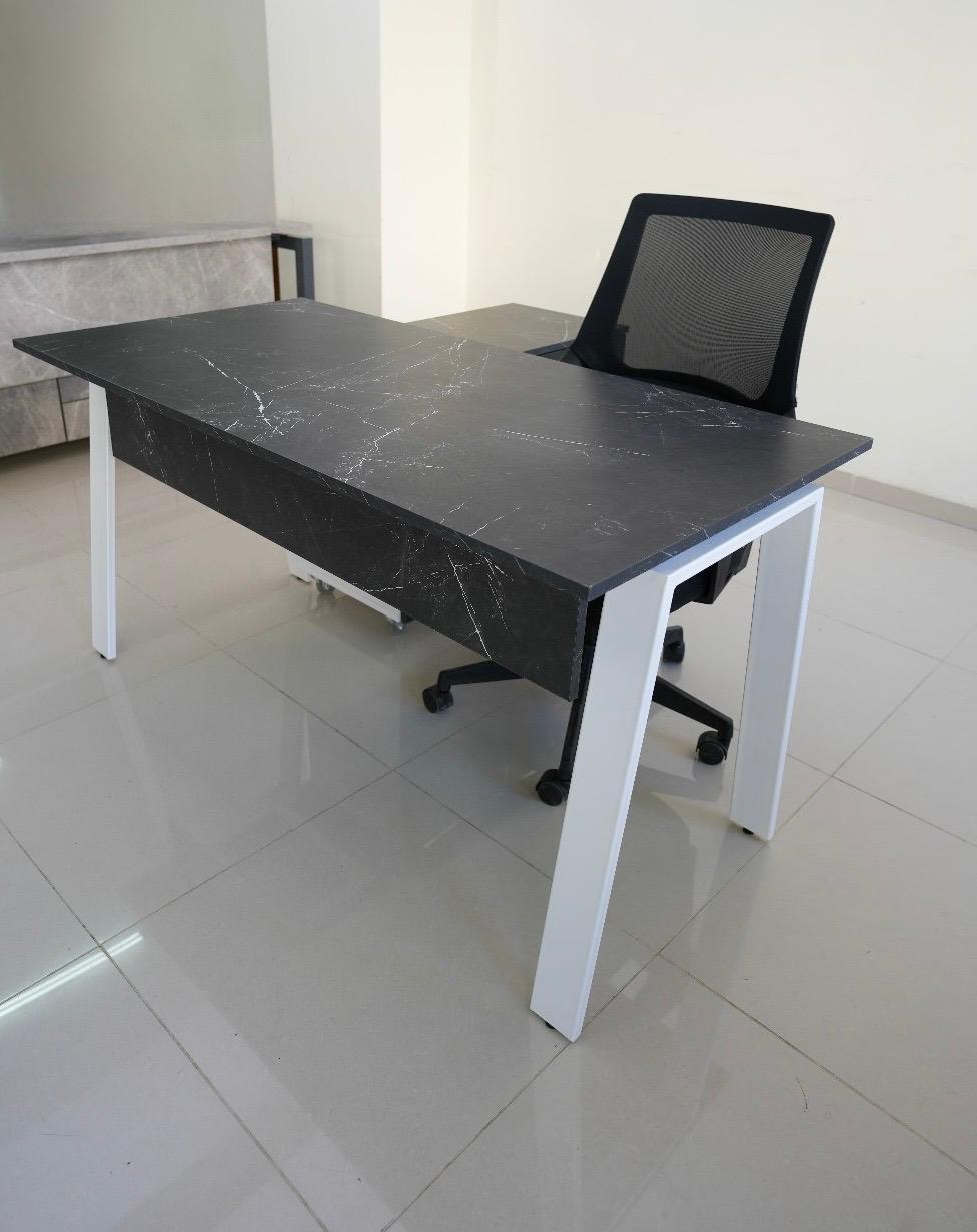Stylish and functional employee desk made of high-quality melamine wood with a black marble finish and modern white metal legs.